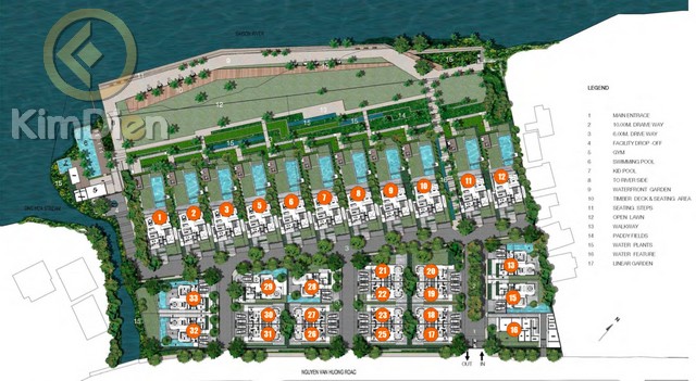 - Biệt thự ven sông có 11 căn, diện tích 798m2 – 1,018m2