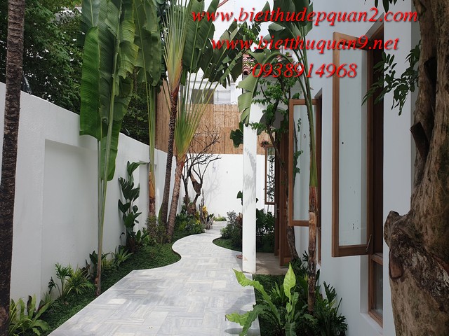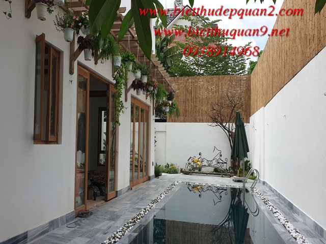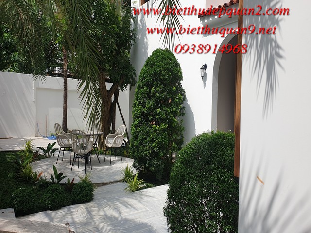 Biệt thự Thảo Điền phong cách Địa Trung Hải, nhà hoàn thiện rất đẹp, sân vườn nhiều cây xanh, tiểu cảnh. Cửa chính, của sổ và của phòng đều làm bằng gỗ tốt.