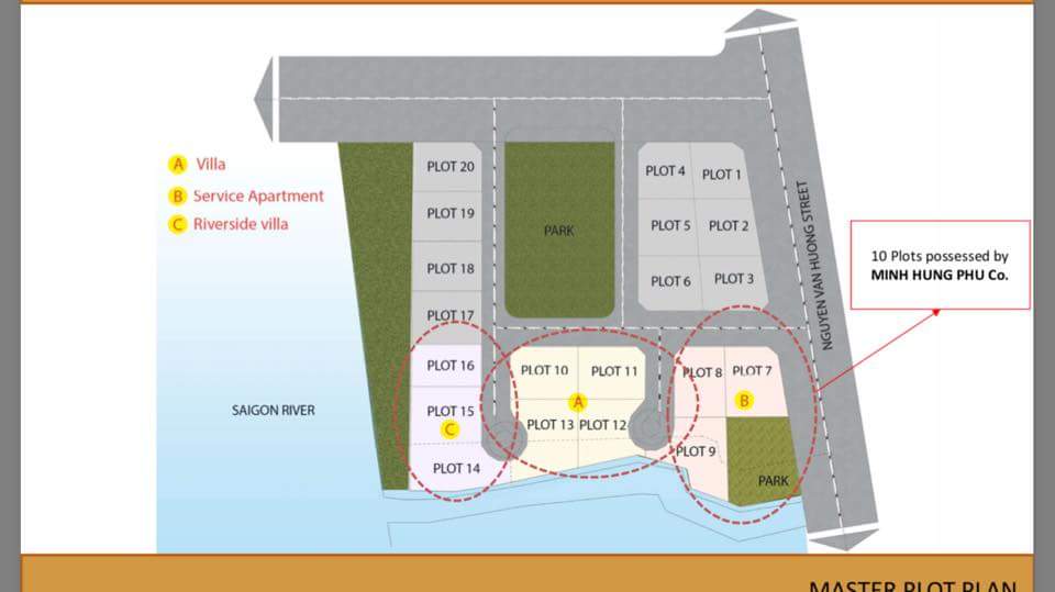 Khu A: Mặt tiền Nguyên Văn Hưởng là căn hộ dịch vụ và khách sạn (3 lô và 1 lô công viên). Diện tích: 329m2 - 283.3m2 - 318.3m2 và 456m2 là công viên.