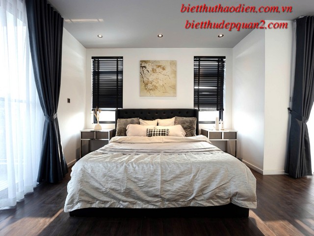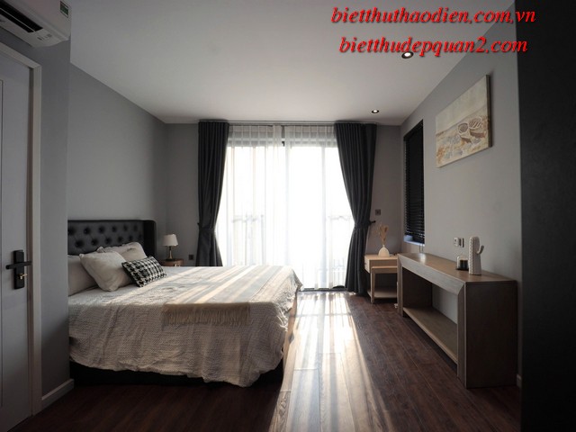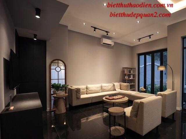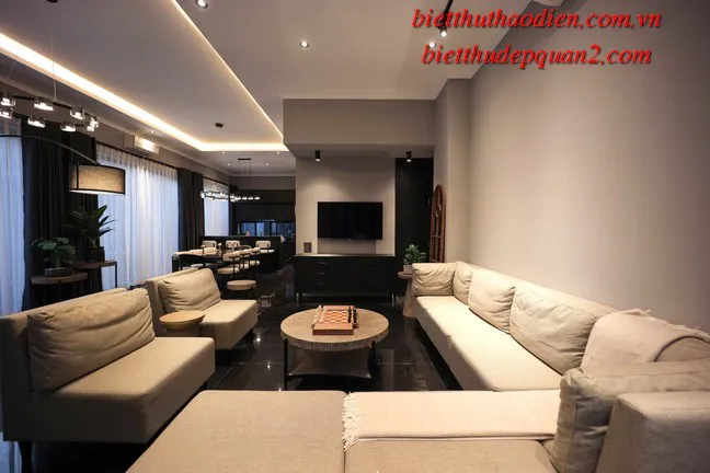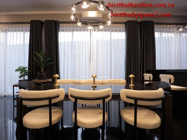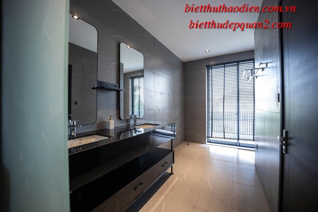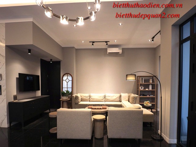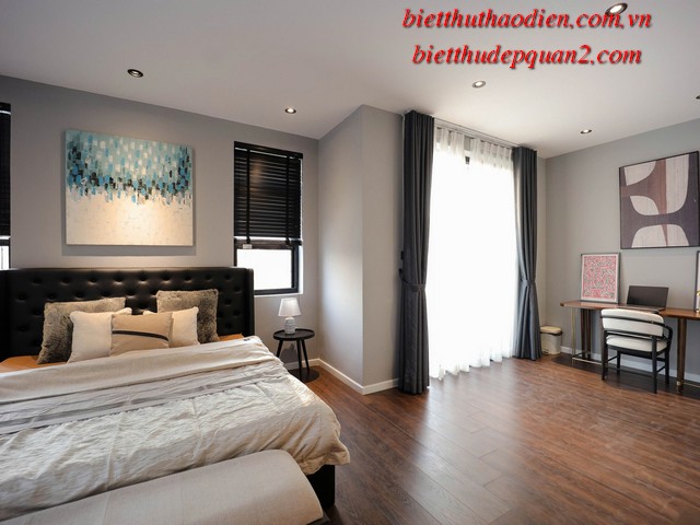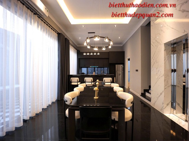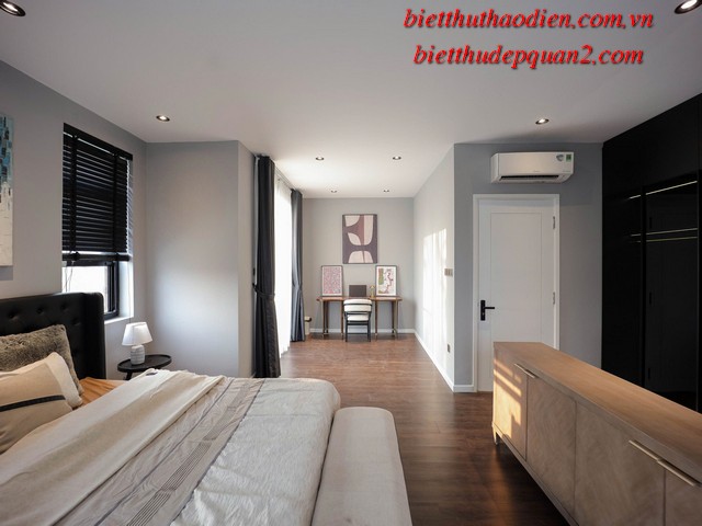 Điểm nổi bật của biệt thự bao gồm: phong cách kiến trúc hiện đại, nội thất cao cấp sang trọng với tông màu nâu chủ đạo, tạo nên không gian sống ấm cúng và tinh tế. Thêm vào đó, biệt thự còn được trang bị thang máy tiện lợi, cùng tầm nhìn hướng sông yên bình từ các phòng ngủ, mang đến sự thư thái tuyệt đối.